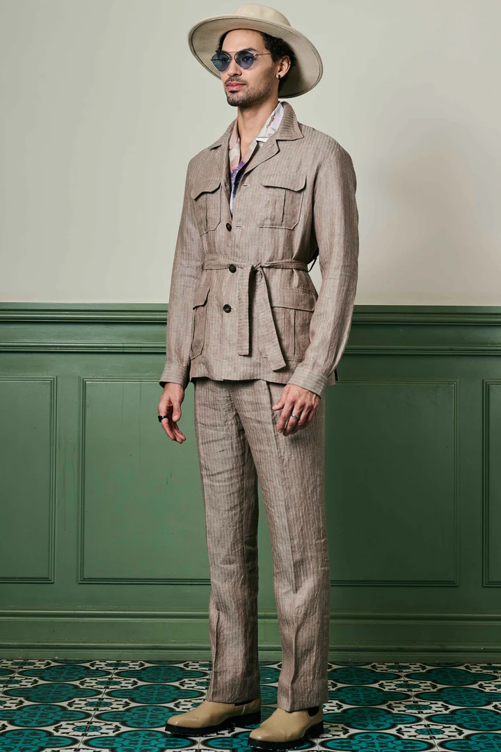 Herringbone Textured Linen Safari Suit